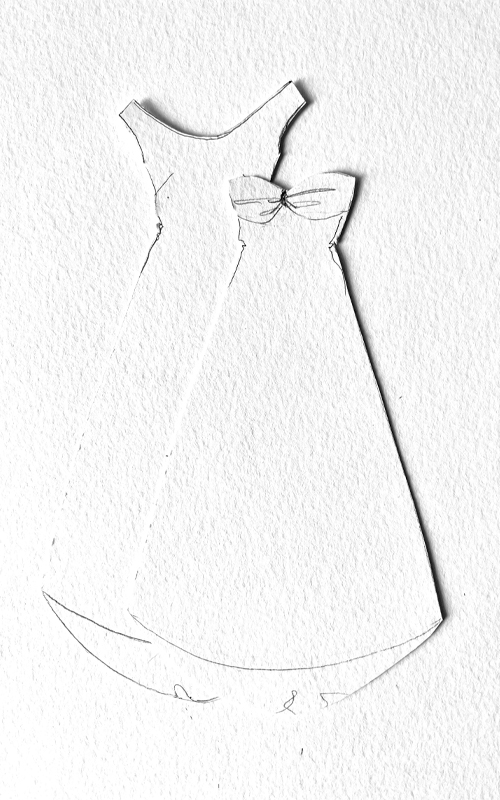 Das Gewicht des Stoffes gibt dem Kleid bei aller Stofffülle einen eleganten schmalen Fall, der sich in der Bewegung aufdreht.